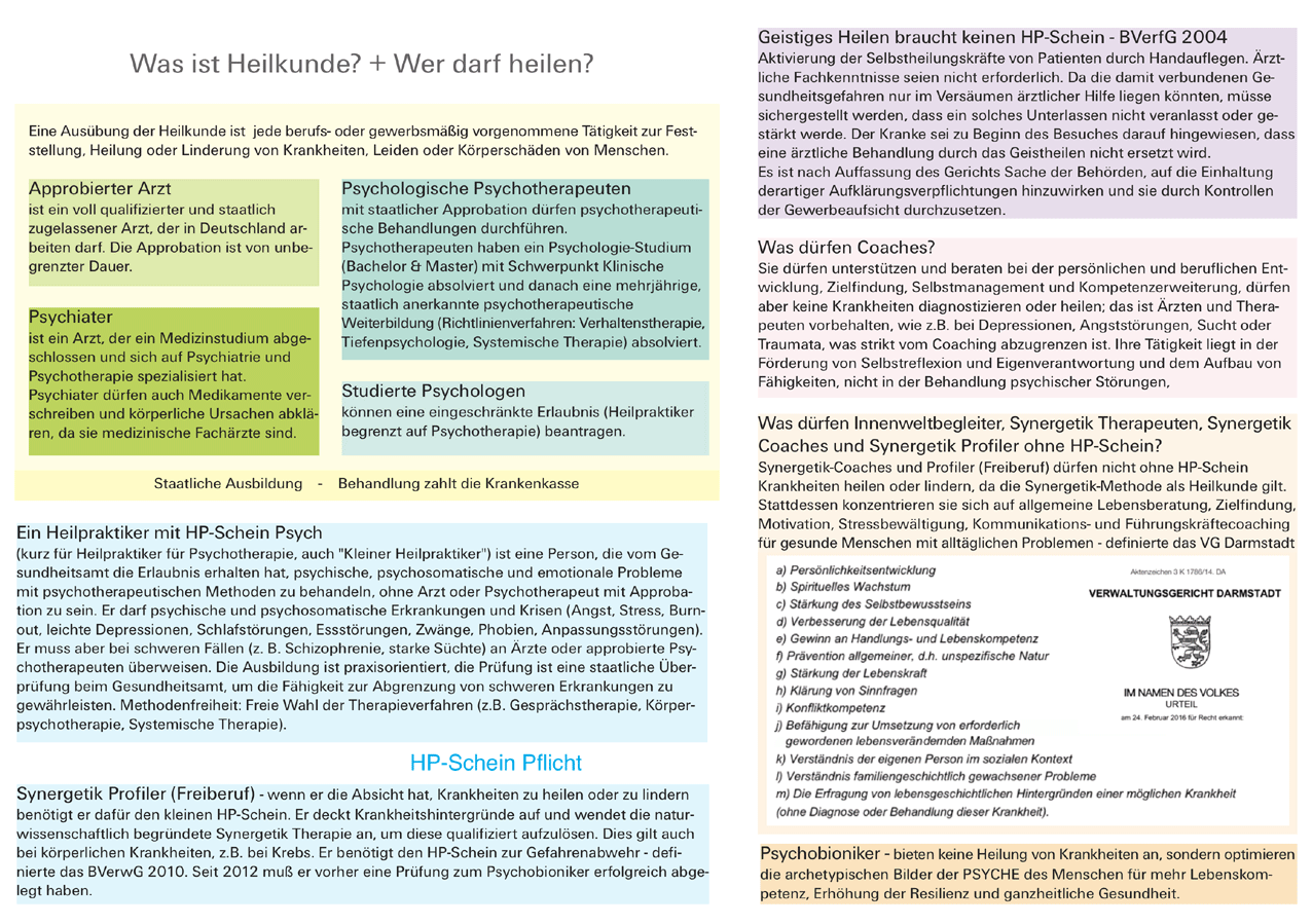 | Das Verwaltungsgericht Darmstadt fällte 2016 nach einigen Jahren eines vergeblichen Versuches der Einigung mit dem Hessischen Innenministerium in Verbindung mit dem Berufsverband Psychobionik maßgebliche Orientierungen, die heute noch gelten und keinen HP-Schein benötigen. | ![]() |