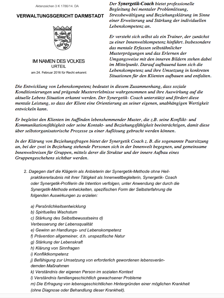 Die eigene Klärungsarbeit durch einen 2. Berufsverband der Synergetik Profiler wurde nicht von den Verwaltungsgerichten akzeptiert. Die Selbstdarstellung der Synergetik Methode aus 2000 bis 2004 wurde als Basis der Beurteilung genommen. In dieser Anfangsphase wurde die Synergetik Therapie als Selbstheilungmethode auch für sog. unheilbare Krankheiten wie Krebs, MS oder Allergieerkrankungen mit Erfolg angeboten. Ja, wir wollten heilen (weil wir Spontanheilungen immer wieder erlebten) und folgerichtig wurde diese Methode vom Bundesverwaltungsgericht in Leipzig 2010 als Heilkunde bestätigt und ein HP-Schein zur Gefahrenabwehr gefordert. Gleichzeitig wurde höchstrichterlich aber auch der Denkansatz von Bernd Joschko bestätigt: Symptome darf man nicht bekämpfen, sondern man muß den Hintergrund aufdecken und auflösen. Wegen dieser Haltung hatte noch das OVerwG Lüneburg 2009 festgestellt: