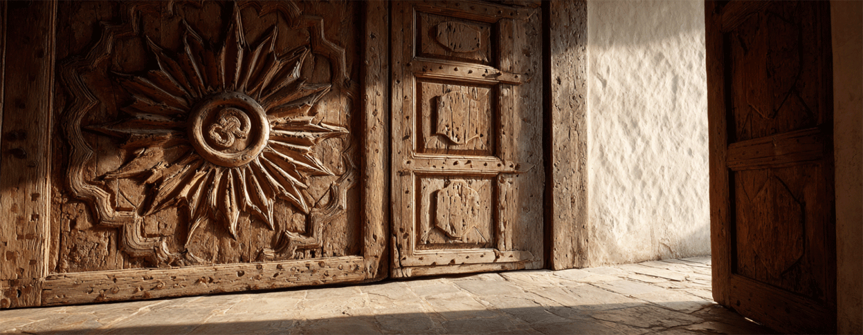 Symbolraum: Eine Gartentreppe führt zu einer schweren Holztür. Symbol: Auf der Tür ist eine Sonne abgebildet. Doch öffnet man sie, ist dahinter nichts – nur eine Mauer oder ein leerer Raum. Thema: "Vorspiegelung falscher Tatsachen". Es geht um emotionale Abgeschnittenheit, Enttäuschung über fehlende familiäre Substanz und das Gefühl, hinter der schönen Fassade (Sonne) innerlich leer und beziehungslos zu sein.